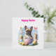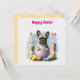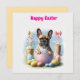 Le bulldog français veut Happy Easter avec beaucoup d'oeufs peints en pâte et une boucle rose. Ce chien mignon est assis dans un oeuf de Pâques et a apporté de superbes cadeaux. Des fleurs de printemps colorées et un ciel bleu arrondissent le beau motif animal. Pour chaque amoureux de chien, un beau cadeau.