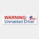 Un autocollant qui dit AVERTISSEMENT : Chauffeur non masqué avec un drapeau américain, j'espère que les gens penseront à porter un masque. C'est un pays libre et nous devrions pouvoir porter un masque ou ne pas porter de masque, surtout en conduisant.