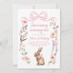 Un lapin tourne une invitation avec un arc rose et des fleurs sauvages, du lapin dessiné à la main et de l'arc.