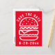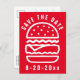 Célébrez votre fête de hamburger avec cette simple enregistrer la carte postale date avec un simple graphique d'un cheeseburger en blanc sur un arrière - plan rouge avec typographie dans une police moderne en blanc. Ajoutez vos coordonnées au verso avec une adresse, un nom, une occasion, un jour, une date, une heure, une adresse et des détails RSVP en typographie noire sur blanc. Conçu par © Tim Coffey.