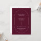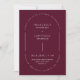 Cette élégante faire-part de mariage moderne et minimaliste dispose d'une arche élégante avec un texte circulaire "joignez-vous à nous pour célébrer le mariage de" élégamment placé au sommet, ajoutant une touche romantique et formelle sur un arrière - plan bordeaux. La police serif sophistiquée met en évidence les noms du couple avec un look propre et raffiné. Le dos de la carte comprend de l'espace pour une photo personnelle du couple heureux et un code QR personnalisable pour les invités à RSVP et trouver plus de détails. Essayez d'être vert avec cette invitation tout-en-un écologique moderne en coupant sur les RSVP supplémentaires et les cartes de détails. Ajoutez simplement votre propre code QR au verso de l'invitation pour que vos invités puissent accéder à RSVP et découvrez plus d'informations sur votre mariage. Customisez les noms et le libellé en quelques étapes simples, et personnalisez la carte d'invitation avec votre photo du couple heureux pour lui donner une touche unique et personnelle. Veuillez noter : les expressions "gentiment joignez-vous à nous pour célébrer le mariage de", "réception immédiatement après la cérémonie" sur le devant et "la faveur de votre réponse est demandée" sur le dos, ainsi que les lignes et les éléments graphiques de l'illustration, ne peuvent pas être modifiés, supprimés, déplacés ou modifiés. Elles sont réparées. Si vous devez modifier la couleur, vous pouvez customiser la carte d'invitation. Vous pouvez facilement personnaliser cette invitation avec votre propre texte et la partager numériquement par texte, e-mail ou médias sociaux. Vous pouvez également envoyer une version imprimée à vos invités ou faire les deux : en envoyant une version numérique et en faisant un suivi avec une copie imprimée pour une expérience plus personnalisée.