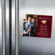 Elégante carte magnétique de faire-part de diplôme de l'université rouge bordeaux avec une photo du diplômé, un casquette de grade d'or, le nom de la diplômée dans la typographie classique de serif d'or, et leur école, major, distinctions ou plans futurs.