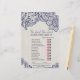Ce jeu de burlap et dentelle marine "il a dit qu'elle a dit" est parfait pour un pays chic douche nuptiale à thème. Le devant de la carte de jeu comporte "il a dit qu'elle a dit", ce qui est un quiz amusant sur la mariée et le marié. Le verso de la carte contient un mot de recherche avec des mots et des phrases mariages. Le design présente de belles délicates fleurs de dentelle bleue sur un arrière - plan de burlap blanc crème et une police de calligraphie moderne féminine. Personnalisez la carte de jeu avec le nom de la mariée et la date de la douche nuptiale.