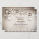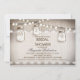Elégant burlap rustique et dentelle blanche design invitation à la douche nuptiale avec collier de lumières et pendre des jarres de maçon.