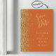 Le bord gauche de ce mariage moderne élégant, à l'exception de la carte magnétique date, comporte une bordure en faux parties scintillant or. Le texte personnalisable combine écriture manuscrite couleur or pâle, cuivre et polices italiques sur un arrière - plan orange brûlé.