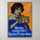 C. 1910 affiche publicitaire gastronomique allemande représentant une belle femme aux yeux bleus tenant le Prométhée, un dispositif de cuisine électrique précoce.
