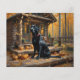 Un beau Labrador noir Retriever se trouve devant un cabine en bois en bois en automne