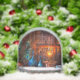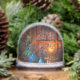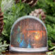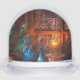 Une scène cabine rustique et cosy avec un bureau avec plumes de paon dans un vase en cuivre, poteries bleues, livres et lampe à kérosène. Le clair de lune est visible à travers le gel hivernal sur les vitres.
