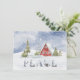 Cette adorable carte de voeux d'hiver présente un cabine rouge à cadre A, la neige d'hiver, avec un texte qui dit "PEACE" dans les lettres décoratives d'animaux de forêt. Le dos a une colline enneigée avec de l'espace pour écrire dans votre propre message.