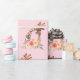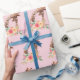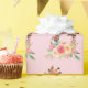 Papier enveloppant avec un dessin mignon en aquarelles d'une maman et d'une petite girafe. La girafe mère se repose la tête au-dessus de la petite girafe, aimante et adorable. Joli bouquet de fleurs d'aquarelle rose, jaune, vert placé sous cette paire de chatons. Arrière - plan rose clair.