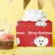 Amusement et chien mignon de Bichon Frise avec l'enveloppe de cadeau de Joyeux Noël de lumières de Noël