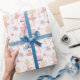 Joli papier d'emballage Ballerina personnalisé avec trois ballerines différentes avec un bouquet de fleurs, des chaussons de ballet et un tutu. Un message d'accueil personnalisé et un nom personnalisé font de ce papier des occasions spéciales.