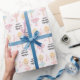 Papier d'emballage personnalisé Ballerina avec trois ballerines différentes avec un bouquet de fleurs, des chaussons de ballet et une couronne. Un message d'accueil personnalisé et un nom personnalisé font de ce papier des occasions spéciales.