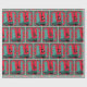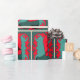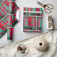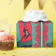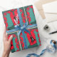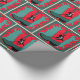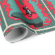 Papier d'emballage cadeau occidental avec une botte de cowboy qui a un design approprié sur elle. L'arrière - plan a turquoise vert avec des pattes de points et un cadre tourbillon rouge.