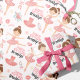 Joli papier d'emballage Ballerina personnalisé avec trois ballerines différentes avec un bouquet de fleurs, des chaussons de ballet et un tutu. Un message d'accueil personnalisé et un nom personnalisé font de ce papier des occasions spéciales.