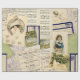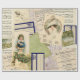 Collage sur le thème de Noël de cartes postales vintages, écriture manuscrite, partitions et étiquettes d'expédition en bleu glacière et vert. Les images comprennent une fille tenant un sac de lettres, une dame du calendrier avec un élégant casquette en plume, et des cartes saintes et un faux orteil. Comprend également l'écriture vintage en français et la première page d'un journal français "Le Petit Journal".