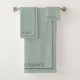 Monogramme cette belle serviette de bain vert sauge et grise avec votre nom ou vos initiales. Le set comprend une serviette de bain, une serviette de toilette et un gant de toilette. Ceux-ci font de superbes cadeaux de douche de mariage ou de mariage, ou achetez-les pour égayer votre salle de bain.