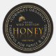 Étiquette noir avec le mot HONEY écrit et réfléchi en or métallique sur arrière - plan noir avec double or et pointillé bordure. L'abeille de miel réaliste fait ressortir le étiquette. Liste précalculée des conversions de poids net miel incluses dans le champ de formulaire. Texte modifiable dans une bordure incurvée pour le nom de l'abeille ou de l'apiculteur, et message cadeau.