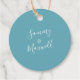 Ces étiquettes de remerciement uniques présentent les noms des mariés dans une police de caractères manuscrits modernes sur un fond bleu turquoise uni. La carte comporte au verso une couleur complémentaire avec un espace pour la personnalisation. Utilisez-les pour les cadeaux de demande en demoiselle d'honneur, les remerciements aux clients de l'hôtel et les faveurs de mariage ou de fête. Pour voir les articles assortis de Victoria Grigaliunas, visitez DoTellABelle sur Zazzle à www.zazzle.com/dotellabelle