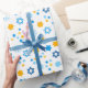Ce papier d'emballage moderne est super mignon ! Il possède des points funky, des flocons de neige et des étoiles de David tous en bleu et or. Obtenez assez pour envelopper tous vos cadeaux ! Ils auront l'air fabuleux !