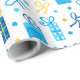 Ce papier d'emballage moderne et tendance est fabuleux ! Il a des cadeaux Hanoukka joyeusement emballés en or et bleu. Obtenez assez pour envelopper tous vos cadeaux.