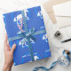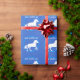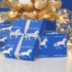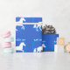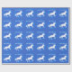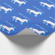 Une jolie silohouette de cheval blanc traverse ce papier d'emballage bleu. Le cheval est soutenu par un cadre circulaire bleu pâle et les mots heureux anniversaire en hébreu sur le dessus de chaque tuile (Yom Huledet Sameach).