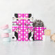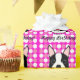 Amusement et chien mignon d'anniversaire de Boston Terrier avec l'enveloppe de cadeau d'arrière - plan de pois