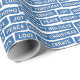 Un papier d'emballage avec des mots de Noël. La motif est composée des mots "Joyeux Noël", "Hohoho", "Père Noël", "Paix", "Célébration", "Joie", "Joyeuses Fêtes" et "Amour" en bleu et blanc. Customisez la couleur arrière - plan, la taille du motif entre autres options.