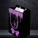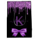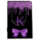Un sac de faveur pour une fête d'anniversaire girly et glamour, une douche de mariée ou une baby shower. Fond noir décoré de gouttes de paillettes fausses violettes, aspect peinture qui coule et un nœud. Avec le texte : Merci ! Personnalisez et ajoutez votre nom. Le nom est écrit avec un style de lettrage manuscrit tendance avec des fioritures. Pour garder les fioritures, supprimez simplement le nom de l'exemple, laissez les espaces ou les émojis devant et après le nom.