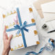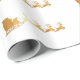 Papier d'emballage de luxe avec le petit faux Père Noël d'or dans son traîneau avec le renne sur un arrière - plan blanc. Pour être employé pour Noël.