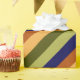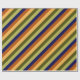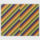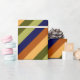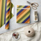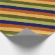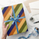 Un rouleau de papier d'emballage avec un design motif de bandes diagonales multicolores en vert olive, vert sauge, marron brun, bleu marine et jaune banane.