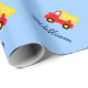Papier d'emballage bleu bébé avec camion de dépôt de jouets et nom personnalisé du garçon. Idée sympa pour le baby shower original ou les cadeaux de 1er anniversaire. Sweet cadeau wrap design pour nouvelle mère ou mère à être. Illustration adorable du camion à benne. Aussi agréable pour Anniversaire ou Fêtes de Noël.
