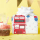 Ce papier d'emballage comporte un autobus rouge iconique de Londres avec des ballons et des confettis de partie - perfectionnez pour le cadeau d'anniversaire d'un enfant.