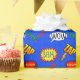 L'action du superhéros du garçon coloré d'amusement exprime le papier d'emballage. Une bande dessinée bleue regardant l'arrière - plan, avec le jaune, les mots de vert, de rouge, et blancs et les bulles d'action décorent ce papier d'emballage d'amusement. Customisez pour ajouter n'importe quel texte supplémentaire que vous voulez.