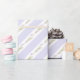 Les bandes violettes et blanches et les fleurs sont le papier cadeau idéal pour un mariage que votre mariée adorera.