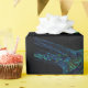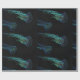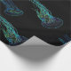 Méduse néon brillante, turquoise et bleue avec une pointe de vert, nageant par contre un arrière - plan noir.