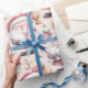Ce délicieux papier d'emballage présente des illustrations fantaisistes du Père Noël profitant de la saison des fêtes. Il est entouré de rennes gais, de sucres de canne, de cadeaux festifs et d'ornements joyeux.