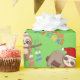 Fentes papier d'emballage de Noël, montrant des paresseux comiques en casquettes de Noël attendant que Père Noël arrive avec leurs cadeaux.