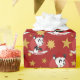 Papier d'emballage de Noël avec l'illustration d'une tête de panda mignon avec casquette Père Noël, en cercle rouge, avec motif jaune avec étoiles, conception de vacances de Noël pour enfants, avec modèle texte personnalisable pour votre nom ou message ; illustré par Radka Kavalcova