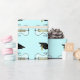 Papier d'emballage de belle obtention du diplôme fait en aigue-marine, avec les graphiques du noir et des casquettes de taloche d'or et le cadre décoratif noir avec des félicitations d'or de lecture des textes. Manière élégante d'envelopper un présent à votre diplômé préféré.