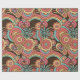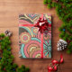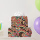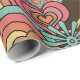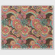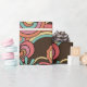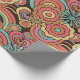 Papier d'enveloppement super Retro Floral Kathrin Legg. Un motif floral rétro aux fleurs orange, rose et jaune, arcs-en-ciel et coeurs sur un arrière - plan chocolat foncé.
