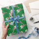 Le papier d'enveloppement de Noël de lièvre sautant présente un lièvre sautant (lapin) dans un chapeau de Père Noël rouge sur une main d'arrière - plan vert vif peint en aquarelle sur du papier texturé.