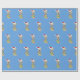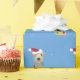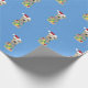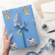 Un messager gallois est drapé de lumières de Noël, orné d'un chapeau de Père Noël, et a une branche de sapin qui sort de sa bouche dans ce papier d'emballage bleu clair de Noël.