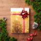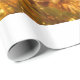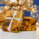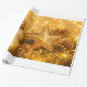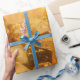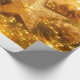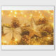 Papier cadeau de Noël élégant avec de beaux ornements dorés (étoile, arc, perles), cônes de pin et lumières scintillantes de Noël.