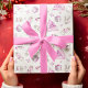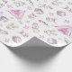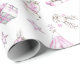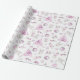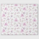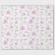 Ce papier d'emballage de Noël rose présente un joli motif d'aquarelle avec des créatures boisées, des boîtes cadeaux, un tipi et des étoiles. Les couleurs les plus en vue sont le rose clair et le blanc.