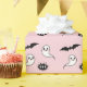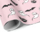 Joli papier d'emballage d'Halloween rose et noir avec le mignon fantôme souriant Kawaii, chauves-souris noires et texte BOO. Offrez à quelqu'un un un cadeau d'Halloween ou d'anniversaire avec une pop de couleur mignonne et inattendue.