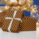 Papier d'emballage conçu avec un motif à damiers noir et orange de taille moyenne. Customisez facilement la couleur orange.