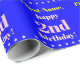 Ce simple design papier d'emballage d'anniversaire comporte un message comme "Prénom, heureux 2e anniversaire!", où le nom et le numéro d'anniversaire peuvent être customisés. Il présente également des formes étoiles décoratives. L'arrière - plan est de couleur bleue. Un papier comme celui-ci pourrait peut-être servir à envelopper les cadeaux qui sont donnés pour célébrer l’anniversaire de quelqu’un. [~Z0000243]