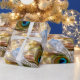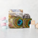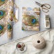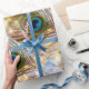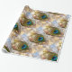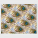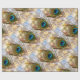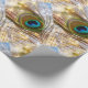 Papier d'emballage de vacances glamour avec belle plumes de paon, moules argentées et lumières de Noël scintillantes