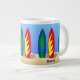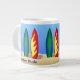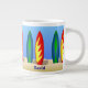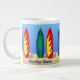 Cette tasse à café à thème surf a des planches de surf colorées et "Surfer Dude" d'un côté et votre nom personnalisé de l'autre. Idée cadeau pour un surfeur !